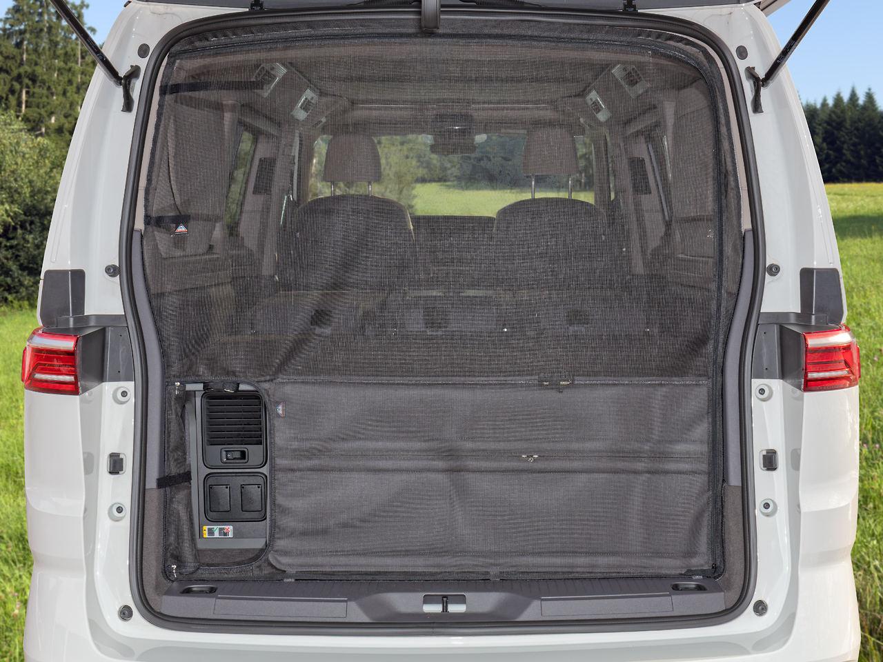 Das Moskitonetz kann stets einsatzbereit am Fahrzeug angebracht bleiben: Die Heckklappe kann beliebig geöffnet und geschlossen werden.